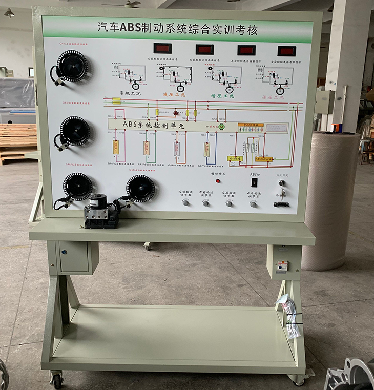 ABS控制單元、ABS電磁閥總成、輪速傳感器、制動(dòng)開關(guān)等。檢測端子、故障設(shè)置系統(tǒng)、大容量蓄電池或12V開關(guān)電源、大型彩色噴繪電路原理圖、控制面板、可移動(dòng)臺架、使用說明書及任務(wù)驅(qū)動(dòng)式實(shí)訓(xùn)指導(dǎo)書等。