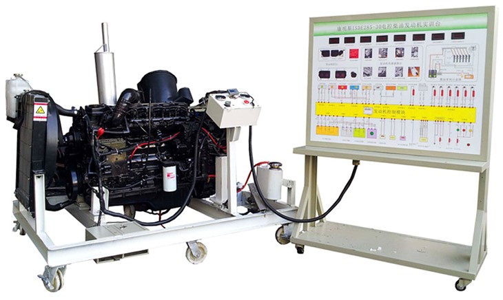 CA1125柴油發(fā)動機總成、組合儀表、發(fā)動機控制單元、散熱系統(tǒng)(水箱、風扇、上下水管)、排氣系統(tǒng)、進氣系統(tǒng)(進氣軟管、空氣濾清器總成)、原車電路原理圖板及檢測端子面板、蓄電池、電源總開關(guān)、燃油箱、油水分離器、油門踏板裝置、可移動機臺架、臺架高溫及轉(zhuǎn)動等部位加裝防護裝置等。