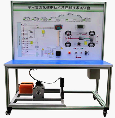 檢測控制面板(裝有各種檢測端子,1448×940mm彩色電路圖和工作原理示意圖)、組合儀表、點(diǎn)火開關(guān)、電機(jī)控制器、車載充電器與充電接口、DC-DC轉(zhuǎn)換器、鋰動(dòng)力電池組、電動(dòng)車電機(jī)(永磁同步電機(jī))、剎車開關(guān)、檔位開關(guān)、油門控制裝置、大電流繼電器、電源總開關(guān)、急停開關(guān)、輔助蓄電池(12V45AH)、一體化全鋁合金型材搭建的移動(dòng)臺架(1500×700×1700mm (帶自鎖腳輪裝置,帶安裝檢測端子的原理面板,面板1448×940mm)、設(shè)備操作說明書。