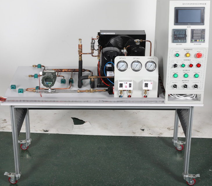 主要由冷凝機組、光管式蒸發(fā)器、冷風機、高低壓開關(guān)、電子膨脹閥(或電磁閥與熱力膨脹閥組合)及能量調(diào)節(jié)閥等通過管路連接,組成一個完整的制冷系統(tǒng)。為滿足競賽(實訓)要求,工作臺安裝板和側(cè)板采用中纖高密度纖維板,學員可在上面自由安裝制冷元器件、手閥、電磁閥、接線盒、表組等配件(大件已提前固定好,如冷凝機組、電氣控制箱等),系統(tǒng)管路由學員自己發(fā)揮搭建,也可參照說明書上的效果圖進行組建。機組架由美觀結(jié)實的型材組裝而成,并配有帶剎車萬向輪,方便調(diào)整設(shè)備的擺放位置。