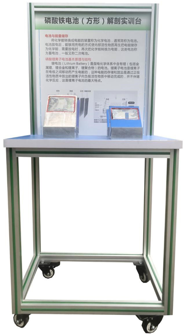 3.實訓(xùn)臺由可移動臺架與原理面板組成,面板立放,繪制三維立體解剖結(jié)構(gòu)圖,介紹單體電池基本知識,展示磷酸鐵鋰動力電池基本參數(shù)。