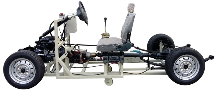 包括前后懸掛系、轉(zhuǎn)向系、傳動系、手動變速器及掛檔機構、制動系等系統(tǒng)、安裝腳輪的可移動式臺架等組成。