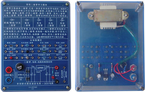 底盒使用190mm×145mm的開(kāi)模有機(jī)透明塑料底盒,模塊面板采用印制電路板PCB工藝,可以直觀看到器件的實(shí)物及相關(guān)的原理介紹。對(duì)于典型應(yīng)用及易損器件安裝在面板背面,透過(guò)透明底盒能夠看到器件實(shí)物,方便感性認(rèn)識(shí)、檢測(cè)測(cè)試,同時(shí)也能防止器件的損傷。