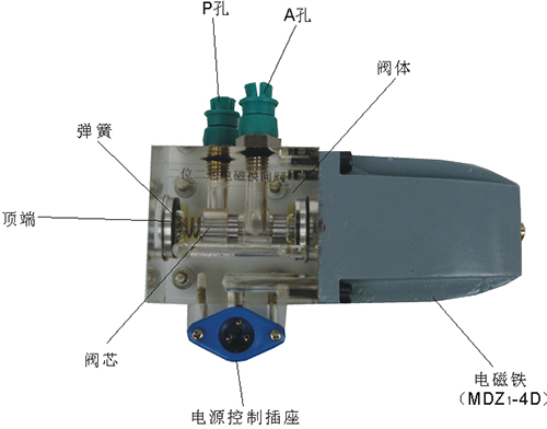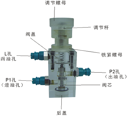 2、液控單向閥結(jié)構(gòu)上參考了國(guó)產(chǎn)IY-25B型液壓?jiǎn)蜗蜷y,其閥體、螺塞等采用了進(jìn)口透明有機(jī)玻璃材料精制而成,閥芯、頂桿采用了45#中碳鋼材料,并配合彈簧,油接頭,密封圈等標(biāo)準(zhǔn)件裝配而成,通過它可明確地觀察到活塞、彈簧、油孔等結(jié)構(gòu)及其運(yùn)行過程,具有形象逼真,性能可靠等優(yōu)點(diǎn)。它即可作為教學(xué)模型,也可以作為液壓實(shí)驗(yàn)元件進(jìn)行實(shí)驗(yàn)演示。