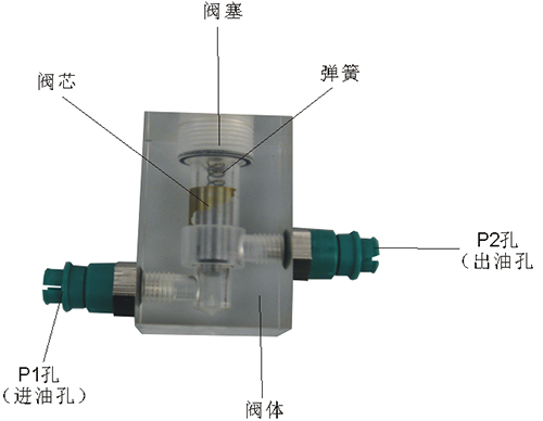 2、單向閥結(jié)構(gòu)上參考了國(guó)產(chǎn)I--63B型板式單向閥,其閥體,螺塞等采用了進(jìn)口透明有機(jī)玻璃材料精制而成,閥芯采用了45#中碳鋼材料,并配合彈簧,油接頭,密封圈等標(biāo)準(zhǔn)件裝配而成,通過它可明確地觀察到活塞、彈簧、油孔等結(jié)構(gòu)及其運(yùn)行過程,具有形象逼真,性能可靠等優(yōu)點(diǎn)。它即可作為教學(xué)模型,也可以作為液壓實(shí)驗(yàn)元件進(jìn)行實(shí)驗(yàn)演示。