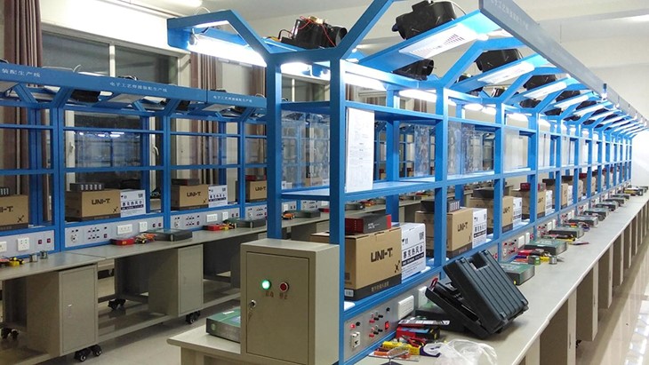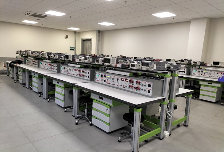 電子工藝實習室是供學(xué)生焊接練習、電子產(chǎn)品組裝調(diào)試操作的實驗室,學(xué)生進行焊接操作。配備的儀器設(shè)備主要有直流穩(wěn)壓電源、示波器、萬用表、工具箱等。為了改善實習室的空氣環(huán)境衛(wèi)生,還專門配備了抽風系統(tǒng)。開設(shè)的課程有《電子工藝實習》、《電工實習》,包括電路元件的選配、電子產(chǎn)品的安裝、焊接和性能測試等環(huán)節(jié)。電子工藝實驗實訓(xùn)室設(shè)備主要面向汽車、機械、電信、電氣、計算機、經(jīng)濟、管理等學(xué)院的學(xué)生,培養(yǎng)學(xué)生的動手實踐能力、分析問題和解決問題的能力以及創(chuàng)新精神。
