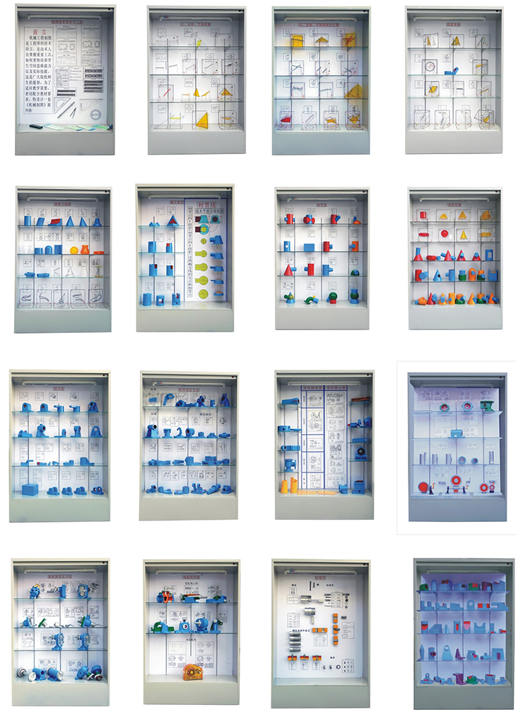 《機械制圖》示教陳列柜是適用于全日制普通中專、職工中學、電視中專、職業(yè)高中機械類專業(yè)的制圖教學,亦可供其它相近專業(yè)使用或參考。為突出培養(yǎng)學生畫圖能力和看圖能力這條主線,對機械專業(yè)學生理論學習,使用范圍增強認識,加深理解,本陳列柜是一套提高教學質(zhì)量的理想設備。